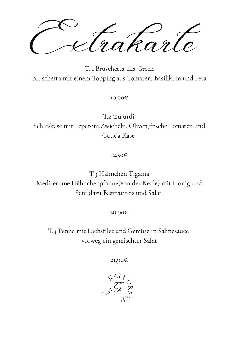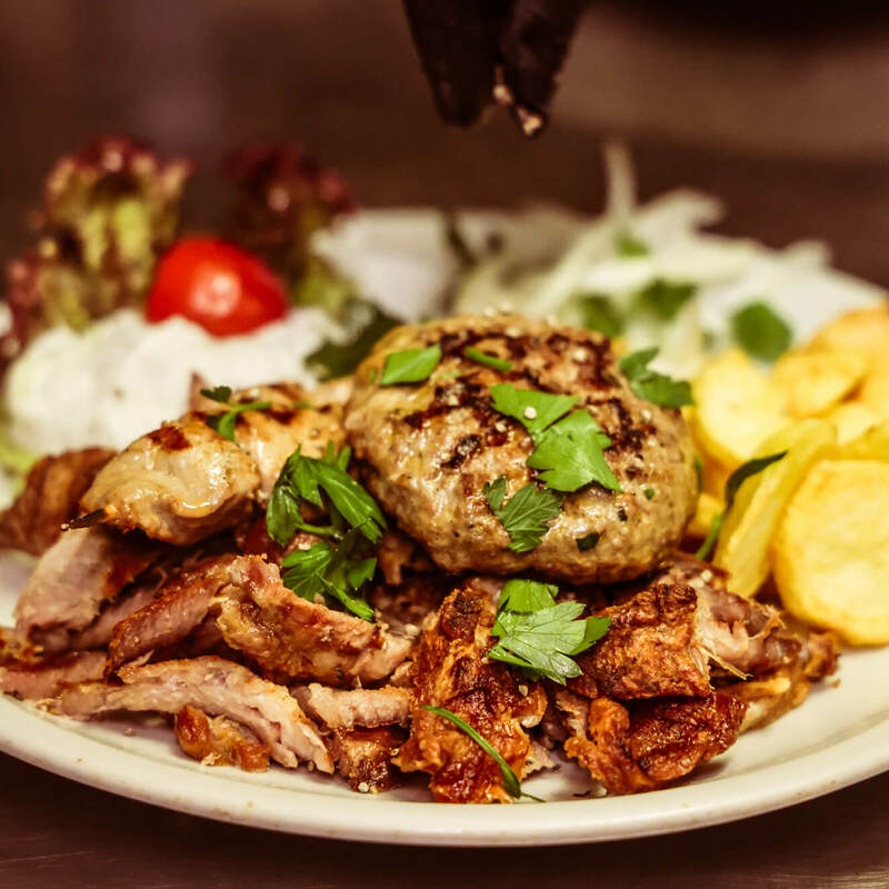 Wir bieten Ihnen eine Vielzahl von traditionellen griechischen Gerichten, die mit den besten Zutaten zubereitet werden. Von unseren frischen Salaten, Vorspeisen und hausgemachten Dips bis hin zu unseren saftigen Fleisch- und Fischgerichten werden Sie den Geschmack Griechenlands bei jedem Bissen erleben.